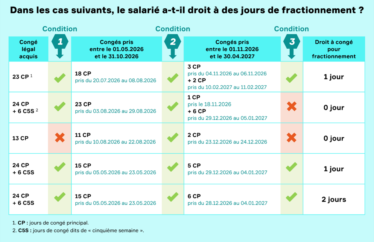Un salarié a pris des congés du 10 au 22 août 2026, puis pose des jours de congé du 21 au 26 décembre. Il a pris 11 jours de congé légal + 1 jour férié (la seconde condition est validée), puis 4 jours de congé légal + 1 jour férié : il acquiert 1 jour de fractionnement.