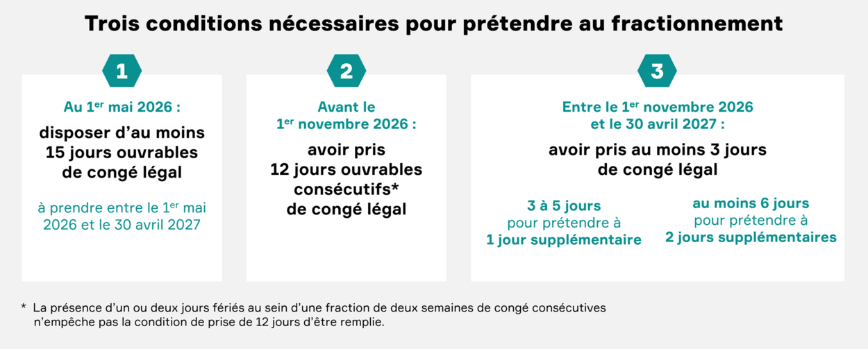 Lorsque le congé principal est d'une durée supérieure à 12 jours ouvrables, il peut être fractionné avec l'accord du salarié. Les jours de congés restant dus au-delà du 12e jour peuvent être accordés en une ou plusieurs fois après le 31 octobre, et jusqu’au 30 avril de l’année suivante. Le nombre de jours de fractionnement attribués dépendra du nombre de jours pris sur cette période.